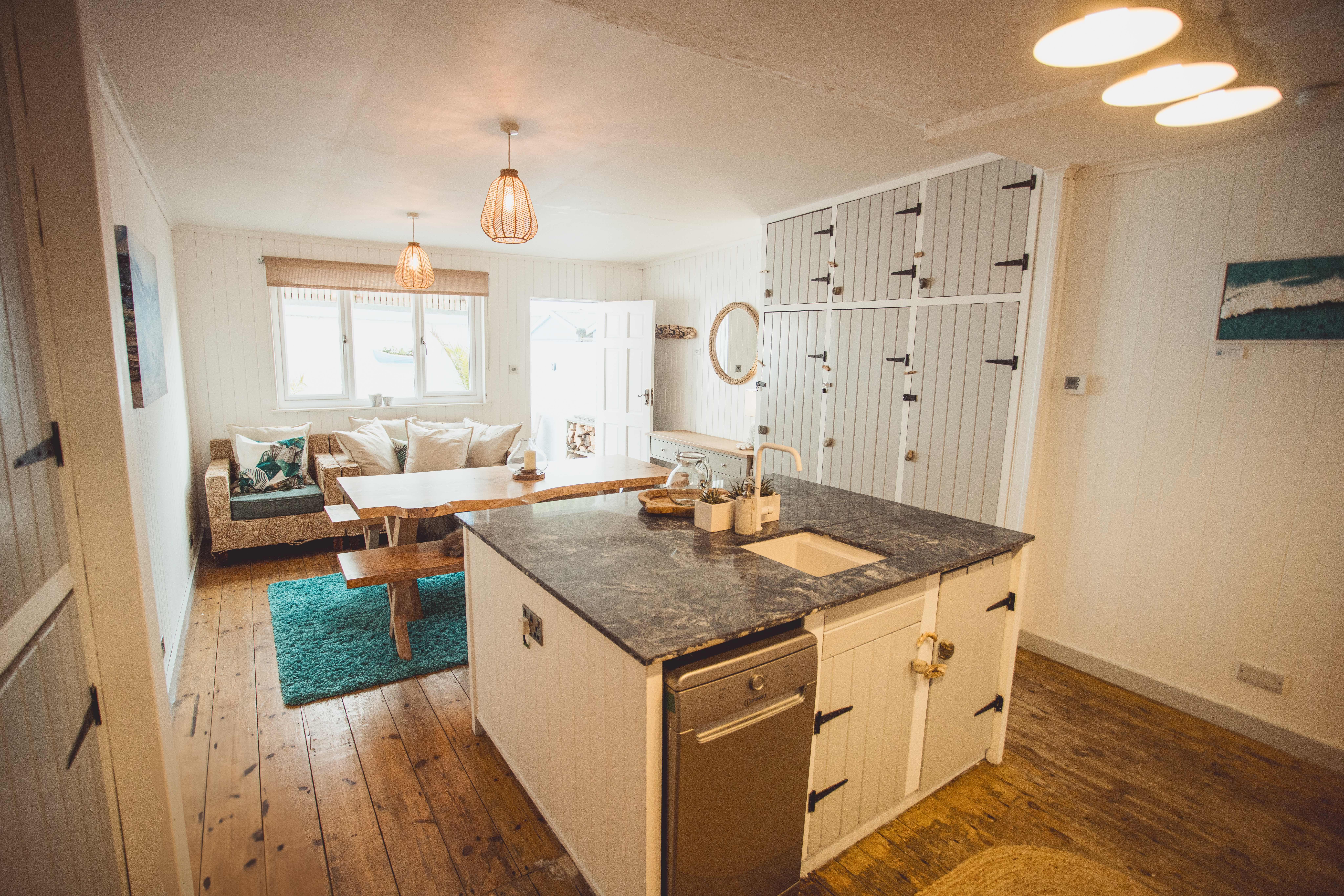 The Chalet is nestled just behind the Cottage, in an elevated position so you get an incredible view of the beach and the stunning Cornish sunsets. The Chalet sleeps four guests comfortably (1x double room, 1x bunk room with small double on the bottom and single on the top, 1x double sofa bed in the living space). It has its own private little courtyard entrance, a decked garden area, a large open plan kitchen, spacious bathroom, free Wifi access, and a log fire in the living space, nestled in sand from the beach. What more could you want for your home from home by the sea?